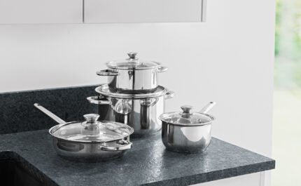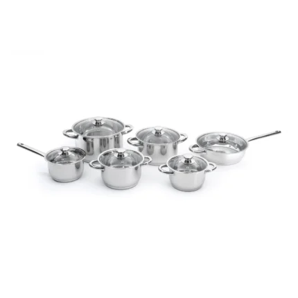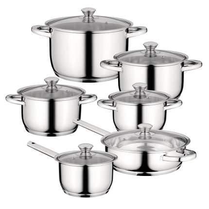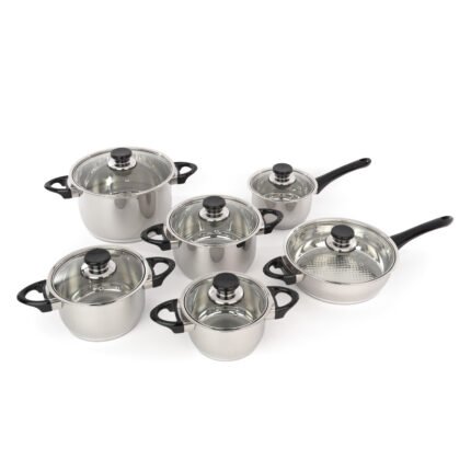 With this 12-pc cookware set you’ll be cooking like a pro in no time. From a high-quality 18/10 stainless steel saucepan to 3 different sized casseroles, a covered stockpot and a covered deep skillet, this set provides you with all the essentials you need to conjure up a wide array of delicious meals on any kind of cooktop, induction included. Every pot is equipped with a 3-layer base for energy-efficient cooking, sturdy handles that ensure a comfortable grip as well as a clear glass lid with integrated steam vent that allows you to keep an eye on your food without having to remove the lid and prevents spillover. Talk about getting the complete package!