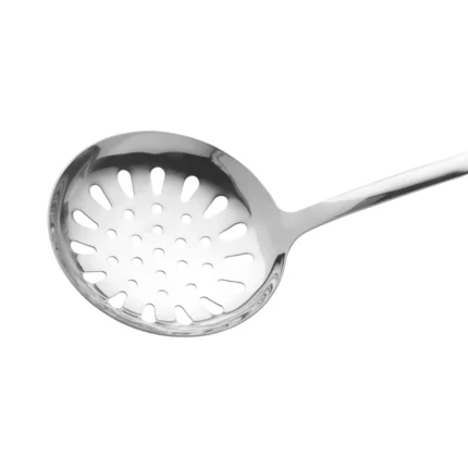 Need to skim floating fat from your homemade stock or want to remove hot foods from boiling water? This skimmer’s sturdy perforated head is the ideal size to precisely control the contents of your pot or pan! The long handle ensures your hand stays well clear of the heat source while the perforation pattern in the skimmer guarantees effortless skimming or draining. An added bonus is the hanging loop in the handle that allows you to store the skimmer on a rack so you can easily keep it at your fingertips.