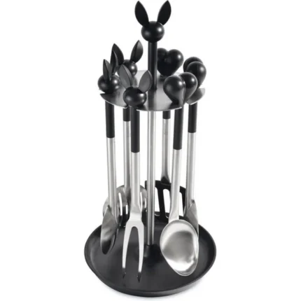 Want to expand your knife collection with some high quality and sleek designed knives and matching knife block? The 13-pc knife block set is an ideal and highly functional solution to your everyday cutting needs. This set contains a high-quality stainless steel knives: paring knife, utility knife, carving knife, bread knife and chef’s knife, poultry shears and six steak knives. In the black rubberwood knife block you can conveniently keep all these knives organized and within reach for your food preparation. To make this set complete, we provided a storage space for the matching knife sharpener and santoku knife. leo
