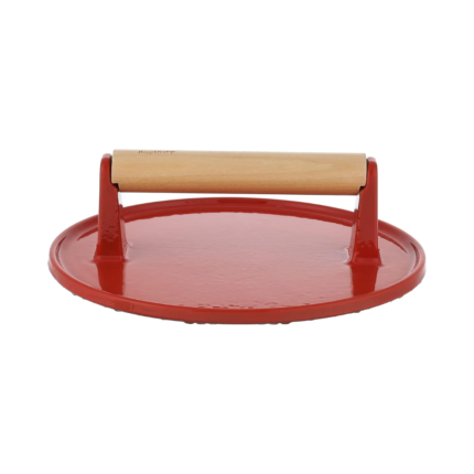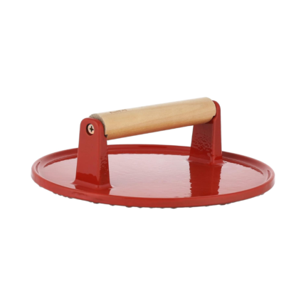 Red Cast Iron Steak Press is made of heavy-duty cast-iron base has a hammered finish. You'll appreciate the stay-cool bamboo handle. This handy cast-iron grill press is coated with vegetable oil and cured at high heat to allow the oil to deeply penetrate the cast iron. It comes pre-seasoned and ready to use right out of the box.