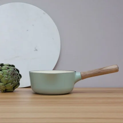 This Ron cast iron saucepan is the perfect combination of functionality and style. Its mint green body brightens up any stovetop while the material keeps your sauce warm for longer, the pouring lip prevents dripping and the enamelled interior is very easy to clean. Making a luscious sauce or a creamy rice pudding has never been simpler!