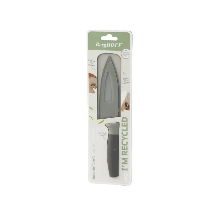 Unique features | Blade with non-stick coating Fitted protective sleeve to protect your hands and the blade Built-in herb stripper Upward curved tip allows rocking the knife for easy mincing Made with recycled plastics |