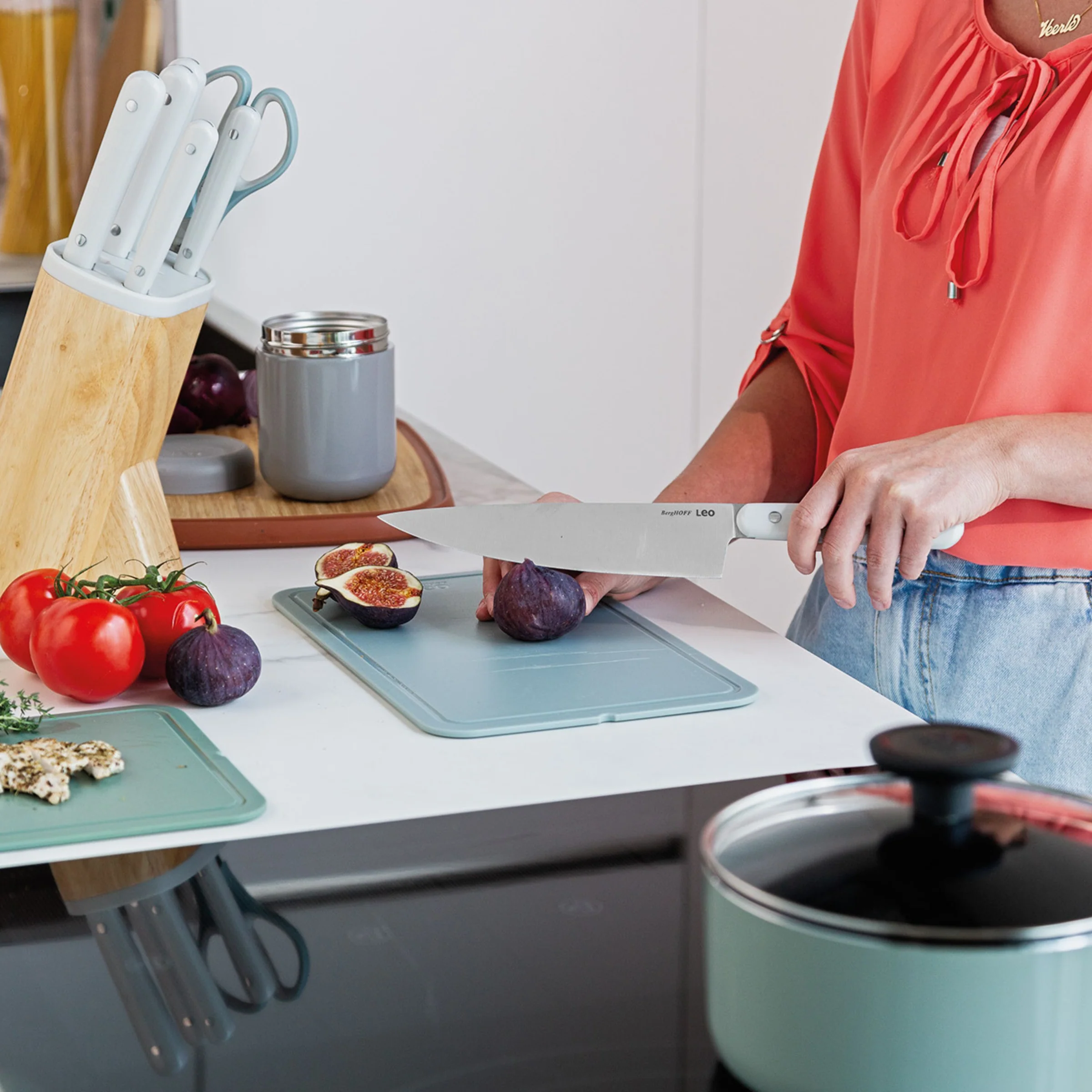 This 3-piece set includes a paring knife, utility knife and chef’s knife, the perfect starter knife set in your kitchen! The all-rounder chef’s knife is for slicing and dicing, the utility knife cleanly cuts foods with a hard exterior and soft interior, and the paring knife tackles all your small-scale cutting jobs.