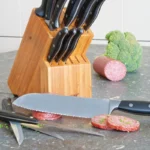 Composition | 1 x paring knife – 8,00 cm (3″) 6 x steak knives – 12,00 cm (5″) 1 x utility knife – 12,50 cm (5″) 1 x boning knife – 15,00 cm (6″) 1 x serrated santoku knife – 19,00 cm (7.5″) 1 x bread knife – 20,00 cm (8″) 1 x chef’s knife – 20,00 cm (8″) 1 x sharpener – 20,00 cm (8″) 1 x a pair of poultry shears – 25,00 cm (10″) 1 x wooden block |