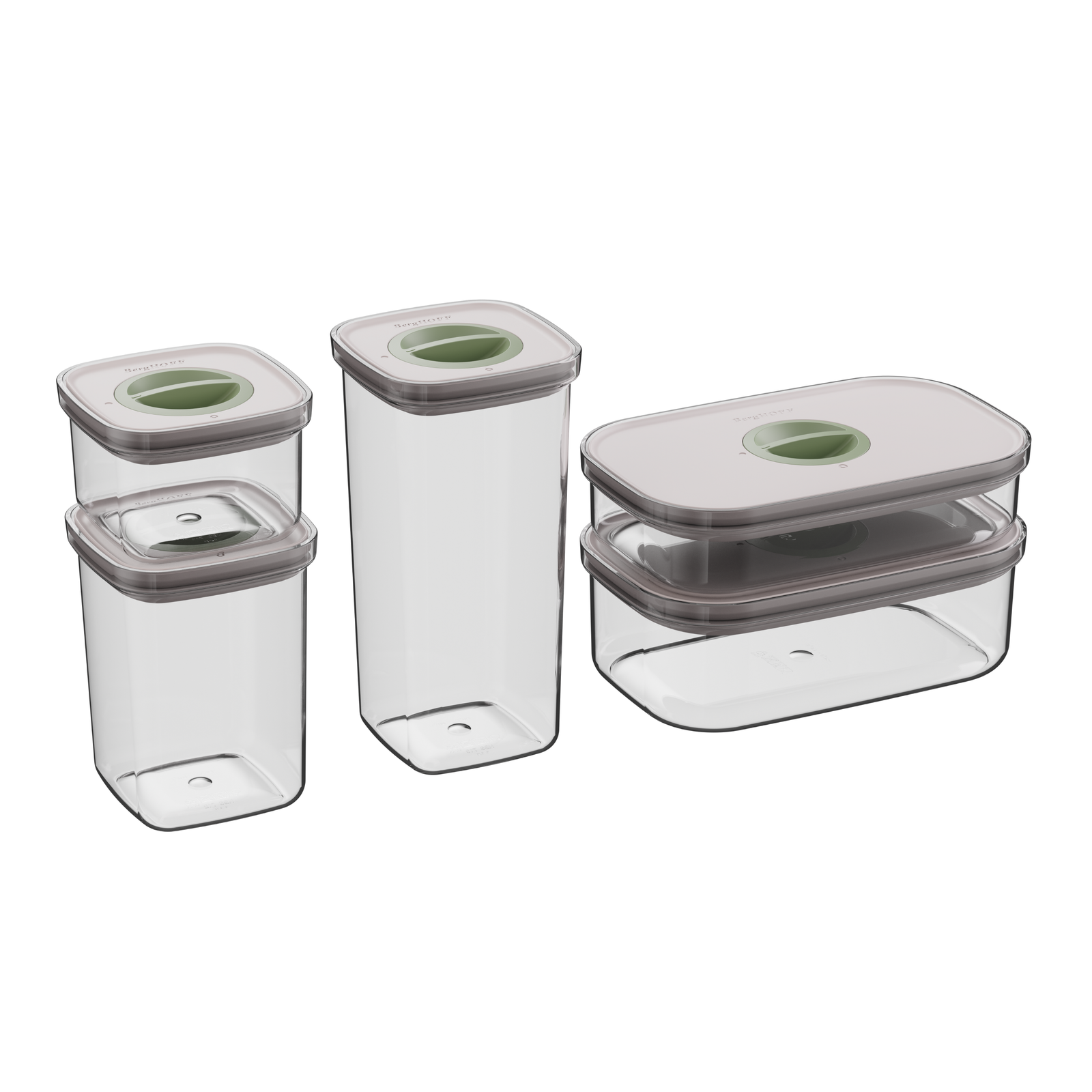 Keep your kitchen organised and your food fresh with this 5-piece smart seal food container set. The set includes containers in 5 food containers in different shapes and sizes, offering versatile storage options for all your needs. Each container features an airtight seal and easy-to-use twist lock to keep your food crisp and leakproof. The stackable design ensures optimal space-saving, while the dishwasher-safe construction makes cleaning effortless. Practical, durable, and perfect for modern kitchens!