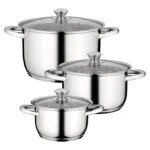 Composition | 1 x covered casserole – 16 cm (6.5″) – 1.9 L (2 qt); 1 x covered casserole – 20 cm (8″) – 3.7 L (4 qt); 1 x covered stockpot – 24 cm (9.5″) – 6.4 L (6.75 qt) |