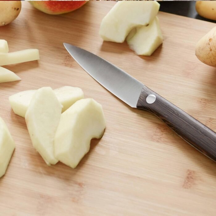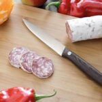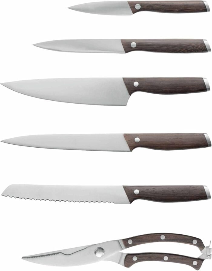 Composition | 1x paring knife – 8,5 cm (3.5″) 1x utility knife – 12 cm (5″) 1x carving knife – 20 cm (8″) 1x bread knife – 20 cm (8″) 1x chef’s knife – 20 cm (8″) 1x poultry shears – 25 cm (10″) 1x wooden block – 21 cm (8.5″) |