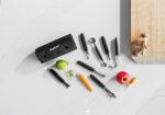 | Composition | 1x lemon zester – 13,50 cm (5.5″) 1x melon baller (double) – 17,00 cm (7″) 1x melon baller – 13,50 cm (5.5″) 1x channel knife – 14,00 cm (6″) 1x butter curler – 16,50 cm (6.5″) 1x peeler – 16,50 cm (6.5″) 1x apple corer – 18,00 cm (7″) 1x folding bag – 37,00 x 20,00 cm (15 x 8″) |