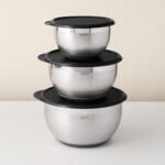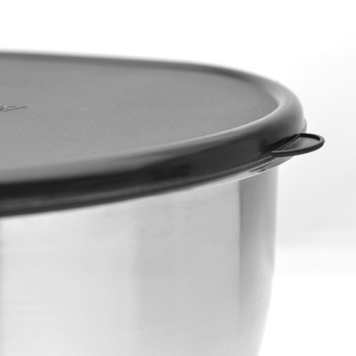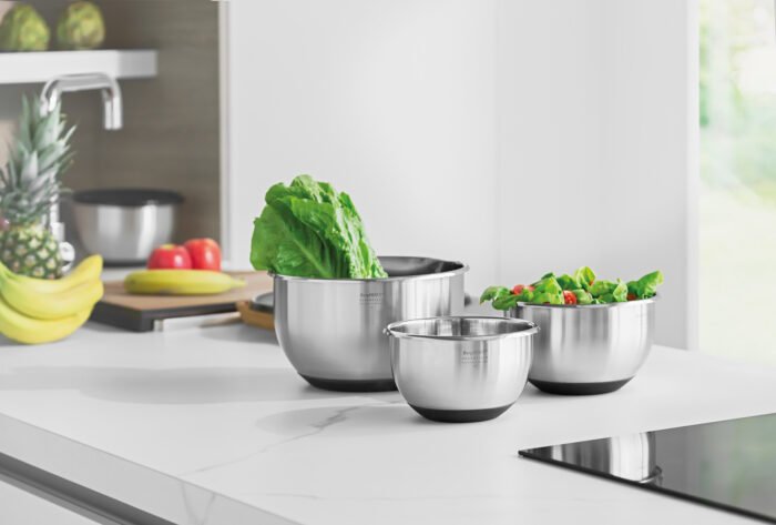 From a couple of eggs to a batch of pancake batter or a summer salad, easily mix anything you need with this set of stainless steel mixing bowls. Thanks to the rubber non-skid base the bowls won’t move or slip off the countertop while you’re mixing and won’t scratch your valuable kitchen surface. Got any fruit, vegetables or leftovers you want to store? Just use the formfitting lids to seal the mixing bowls and you’ve got yourself four high-quality food containers! Once you’re done using the bowls, you can save valuable storage space by stacking them inside one another.