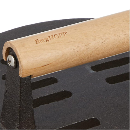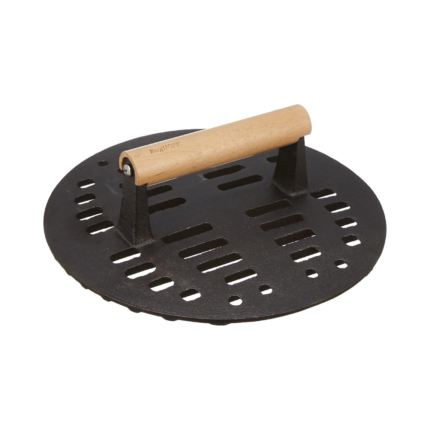 Heavy duty cast iron with hammered finish. Cast iron is known for it’s durable functionality, this bacon press cooks both sides evenly, leaving little room for shrinking. Also great for steaks and paninis!