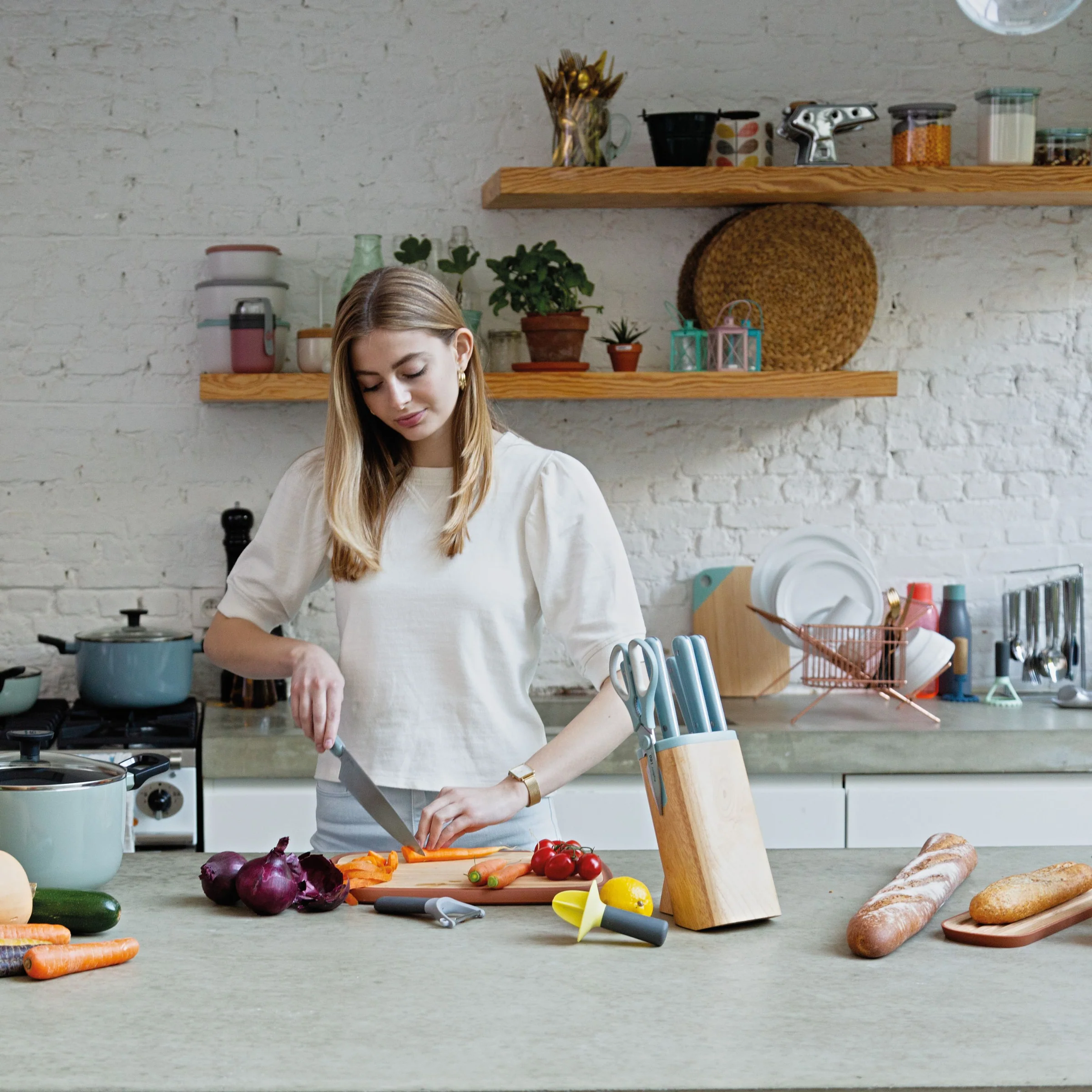 A chef’s knife is one of the most important tools in any kitchen. Meat, vegetables, poultry, … this chef’s knife cuts it all and thanks to the wide, sharp blade it’s also suitable for light cleaving jobs. This chef knife is made from high quality stainless steel Choose between two matching colors and brighten up your kitchen with these glossy finishing knives.
