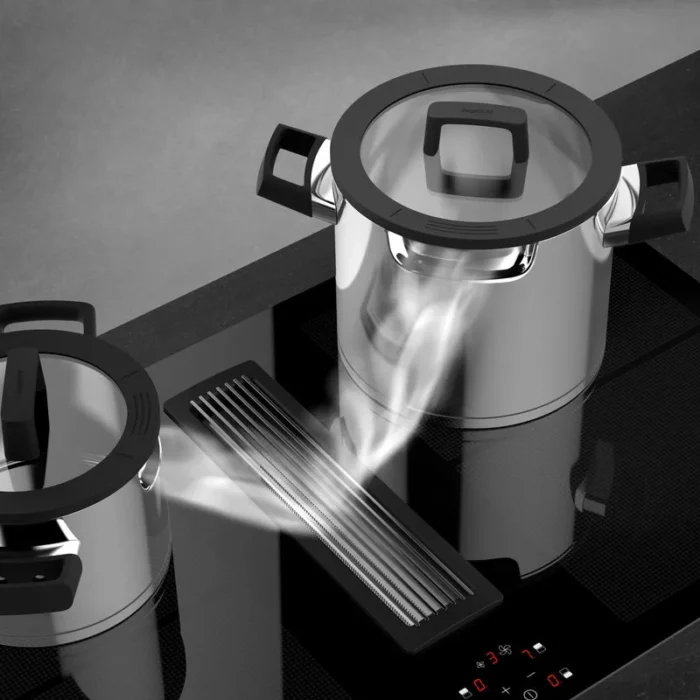 Unique features No lingering odours thanks to its downdraft system, Possibility to close off the pot by rotating the cover 180 degrees, Worldwide patented system, Suitable for all cooktops including induction and downdraft exhaust systems