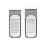 Introducing our innovative double coarse & ribbon grater, made with recycled plastics and crafted for ultimate convenience and efficiency in your kitchen. Use it fully assembled to grate effortlessly over a food container, a cutting board, a plate, … , the non-slip strip ensures stability. Alternatively, detach the two graters to use them as single graters over a bowl, a serving dish, or casserole. Each side of the grater offers a different texture: one side features a coarse texture for robust grating, while the other side is a ribbon grater. Whether you need a stable surface for heavy-duty grating or a portable tool for precision tasks, our double coarse & ribbon grater adapts to your needs, making it an indispensable tool for any culinary enthusiast.