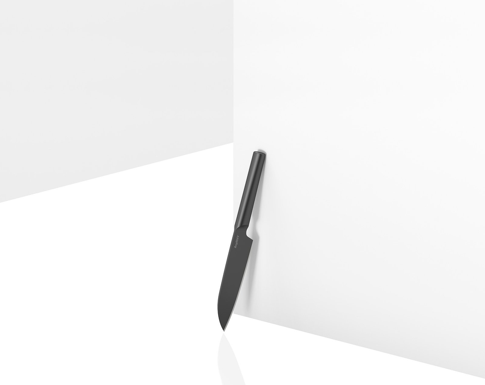 This Japanese-style knife is a great all-rounder in your knife set. It’s lighter than a regular chef’s knife, so you can cut or chop more quickly. The wide blade can also be used to crush garlic and scoop up chopped ingredients. The matching black handle connects seamlessly to the blade, so there are no cracks or screws to worry about.