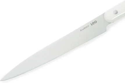 Slicing sweet potatoes, peeling apples or deveining shrimps, the Leo serrated utility knife is your go-to for a wide variety of food preparation tasks. It's smaller non-stick coated stainless steel blade is perfect for precision jobs while the pointed tip can also be used to test the tenderness of your vegetables or meat or remove the seeds from a chili pepper. With it's recycled plastic that's been used for the handle, you're adding a different touch of green into your kitchen.