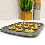 Cookies, pastries or other delicious treats, you’ll easily bake them to perfection on this non-stick cookie sheet. The carbon steel material with a diamond-textured surface guarantees even baking while the non-stick coating makes sure you can easily get your baked goods off once you’ve taken them out of the oven. This means no baked-on mess on the sheet and, more importantly, an easy clean-up!