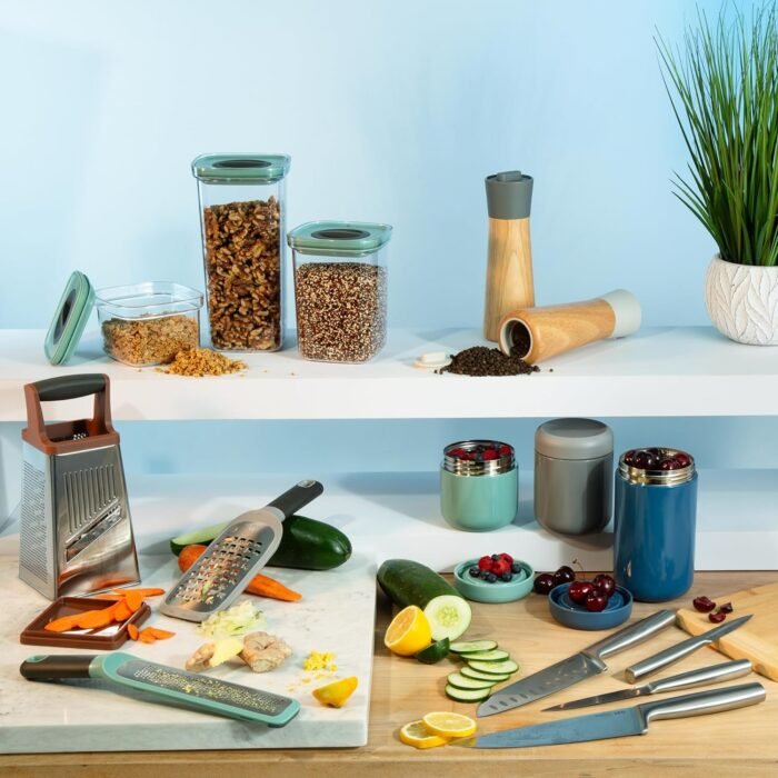 Ground coffee, vanilla sugar, fresh herbs … keep it all fresh and tasty with a little help from these 3 convenient food containers. Their lids instantly add a touch of colour to your kitchen while their large opening allows you to easily fill the canisters and take out just the right amount with the help of the included measuring spoon. On top of that, the containers are stackable for optimal space saving and dishwasher safe so cleaning them is a breeze!